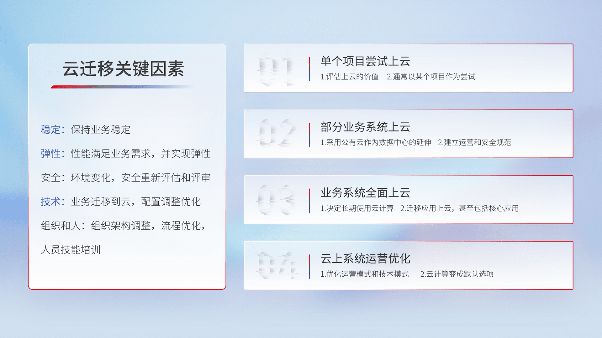 结合实际业务,,,,从规划设计、、、、云平台选型、、云原生改造、、数据迁移、、、、集成交付,,,,迁移全过程为客户识别最佳上云路径,,,做好风险识别管理,,,,设计网络架构、、、、身份权限、、安全审计合规、、、操作审计、、、日志审计、、、监控告警策略、、、多站点容灾设计等,,,,对云上基础设施进行整体规划,,,提升IT治理水平,,以满足弹性、、、高可用、、、、高性能的需求。。。