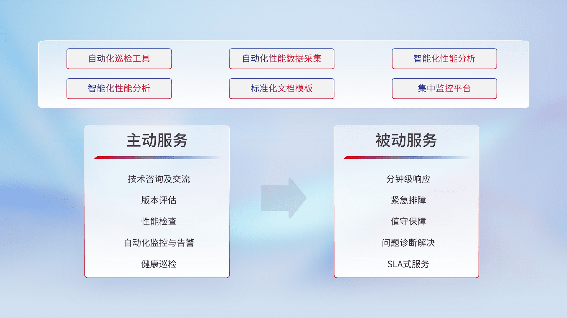 智能化工具和标准化文档,,,保障服务质量,,,,提供主动服务(包含技术咨询、、、、版本评估、、性能检查、、、自动化监控与告警、、、、健康巡检)和被动服务包含(分钟级响应、、、紧急排障、、、、值守保障、、问题诊断解决、、SLA服务)。。。。